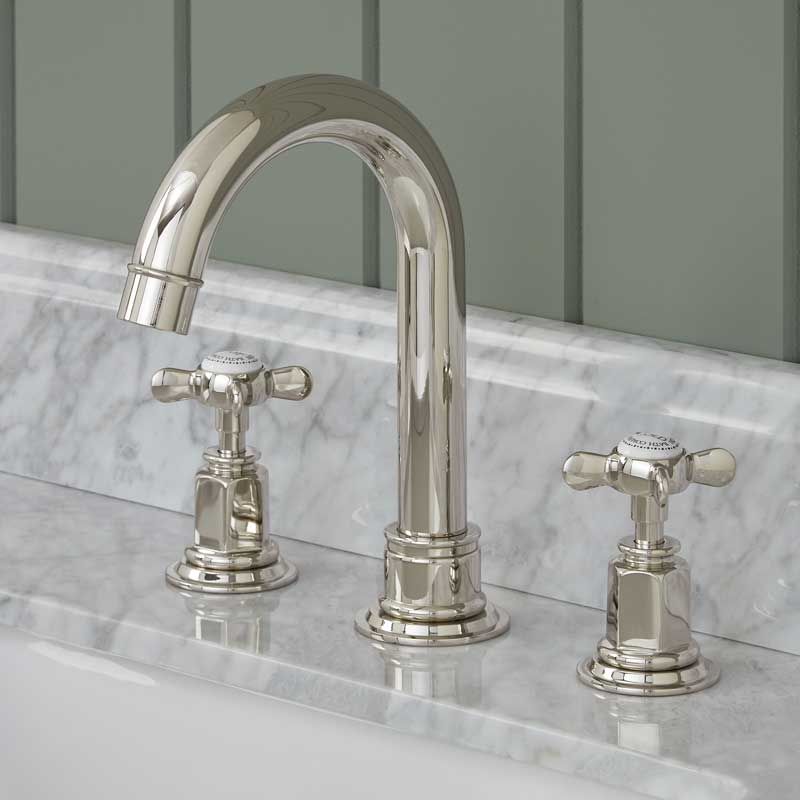 Aysgarth 3 Hole Basin Mixer - Swan Neck Spout - Crosshead - Polished Nickel Finish