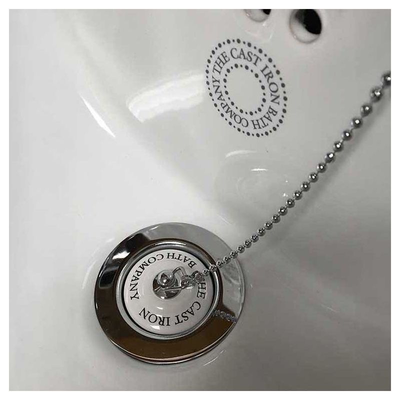 A white porcelain plug with 'The Cast Iron Bath Company' printed in a black, traditional font. This plug comes with a metal drain cover and chain in either a chrome or a nickel finish.
