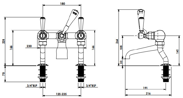 Our own, exclusive design, filler tap is shaped in traditional period style. The white lever taps have German engineered ceramic cartridges with hot and cold indicators. Perfectly matches our Calder range of showers