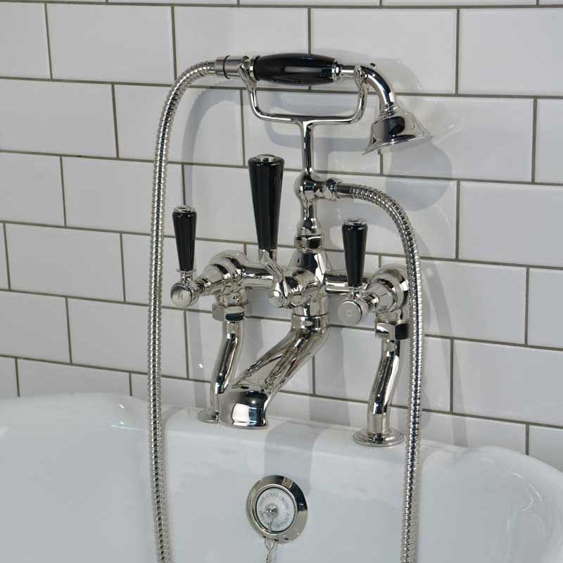 Our own, exclusive design, bath-shower mixer tap is shaped in traditional period style. The black lever taps have German engineered ceramic cartridges with hot and cold indicators. And the shower handle is made from coordinating ceramic.