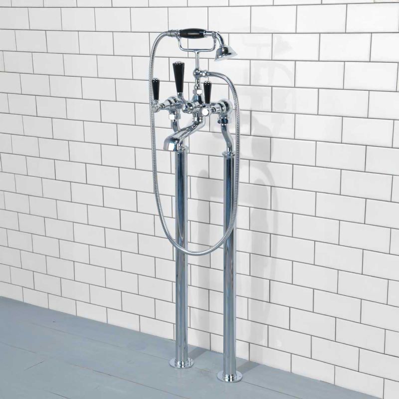 Linton Floor Mounted 2 Hole Bath Shower Mixer with 620mm Standpipes - Black Lever - Chrome
