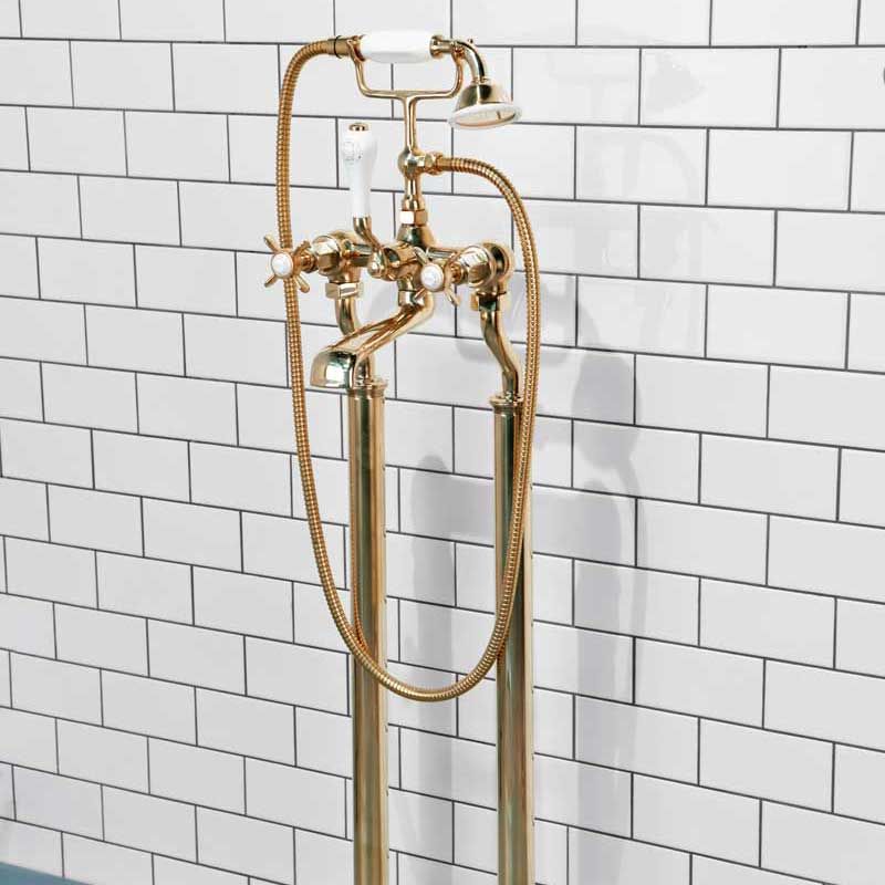 Our own, exclusively designed, freestanding bath shower mixer tap on standpipes. The crosshead taps have German engineered ceramic cartridges with hot and cold indicators. The standpipes are 620mm in length, are supplied with a bracing bar for additional support and cannot be cut down.