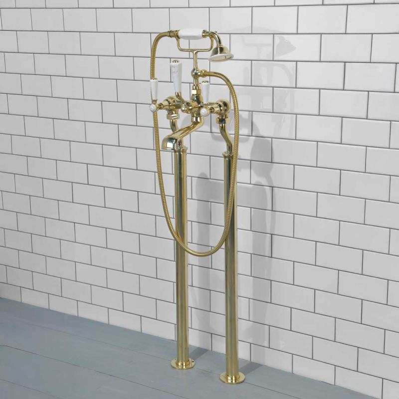 Our own, exclusively designed, freestanding bath shower mixer on standpipes. The ceramic lever taps have German engineered ceramic cartridges with hot and cold indicators. And the shower handle is made from coordinating ceramic. The standpipes can be easily cut down if a lower height is required. Includes flexible tap connectors.