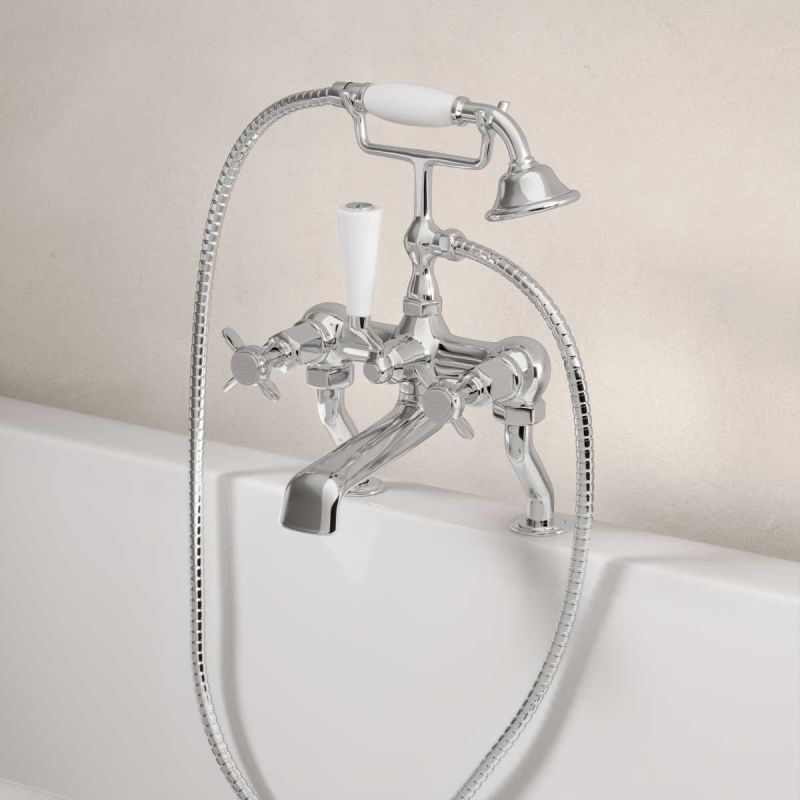 Our own, exclusive design, bath-shower mixer tap is shaped in traditional period style. The cross head taps have German engineered ceramic cartridges with hot and cold indicators. And the shower handle is made from coordinating ceramic. Perfectly matches our Calder range of showers.