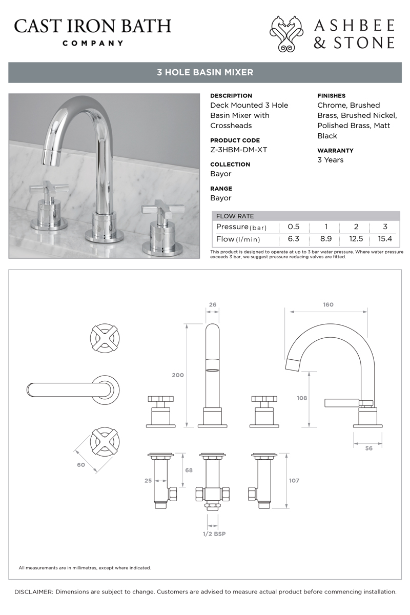 Bayor - 3-Hole Basin Mixer - Deck Mounted - Crosshead