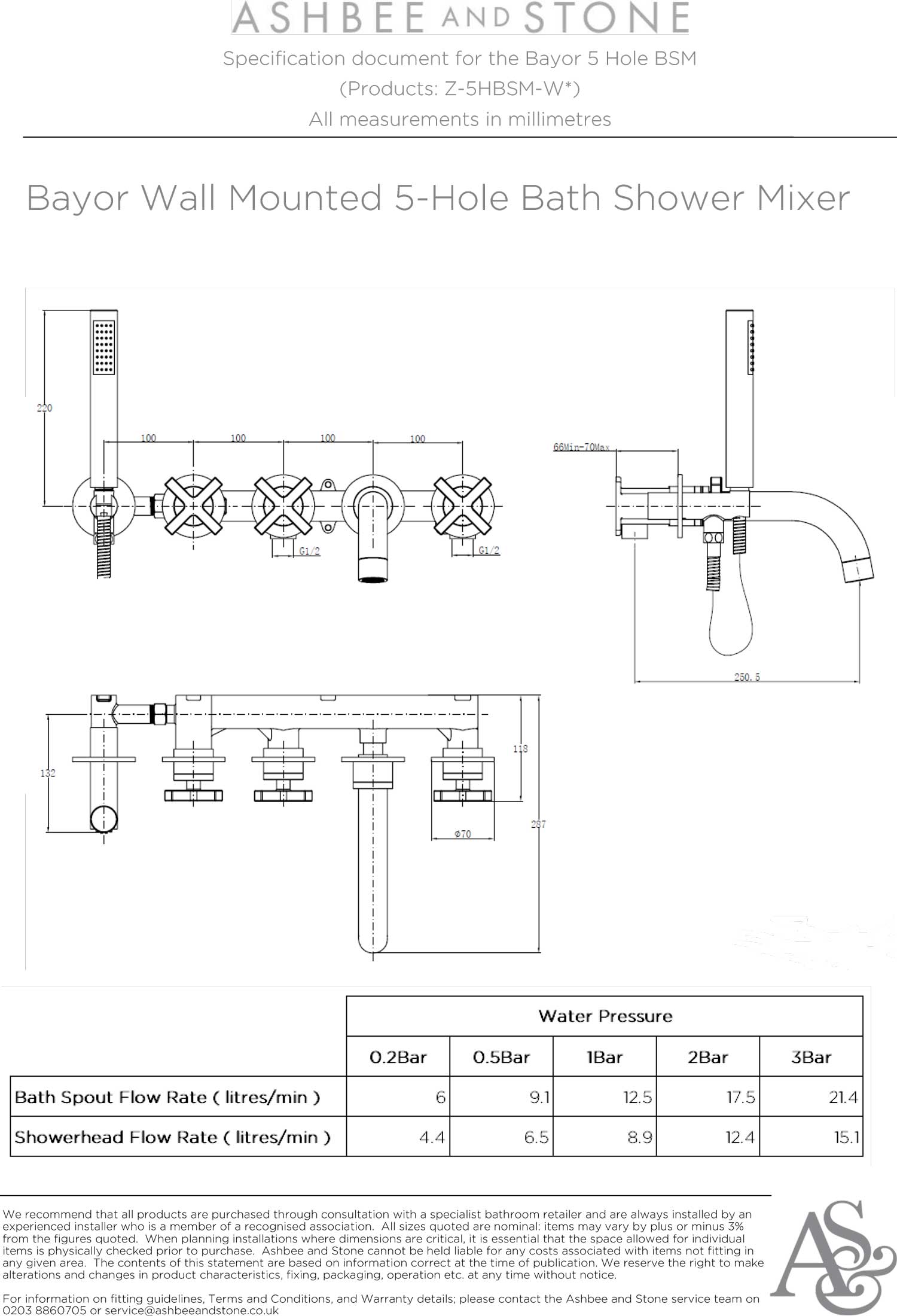 The Bayor 5-Hole Wall Mounted Bath Shower Mixer imbues clean lines and a stripped back look, whilst offering the convenience and versatility of bath filler and hand shower functionality. Each tap, made from solid brass, has a stylish cross-head and German engineered ceramic cartridge for reliable and consistent functionality. The third tap head selects between bath spout and hand shower function.