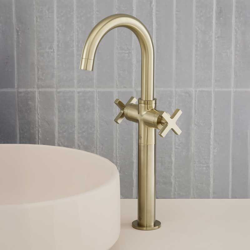 The deck mounted Bayor monobloc basin mixer tap with cross-top (x-top) in brushed brass.