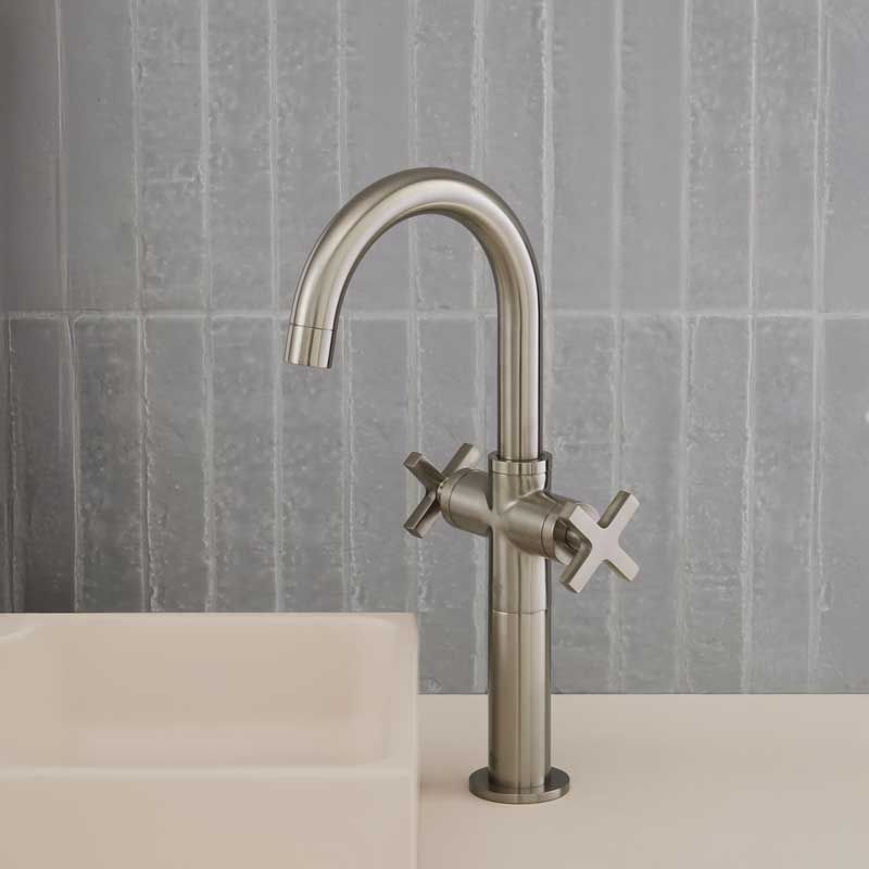 The deck mounted Bayor monobloc basin mixer tap with cross-top (x-top) in brushed nickel.