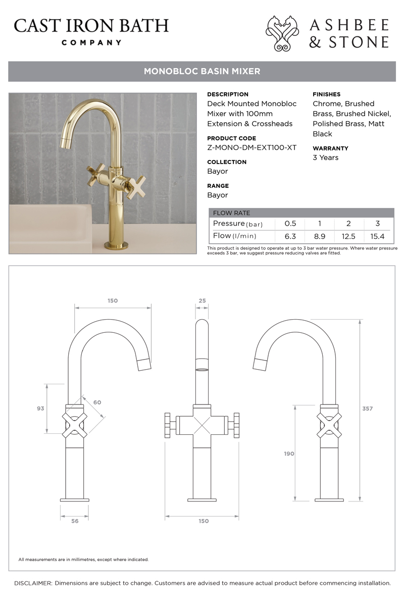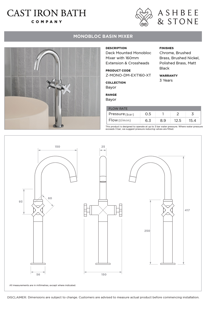 The Bayor Monobloc Basin Mixer Tap is perfect for a stylish contemporary look in your bathroom. The tap is ideal for use with under counter basins but is also available with a choice of extension pieces to enable use with a large variety of deck mounted basin heights.