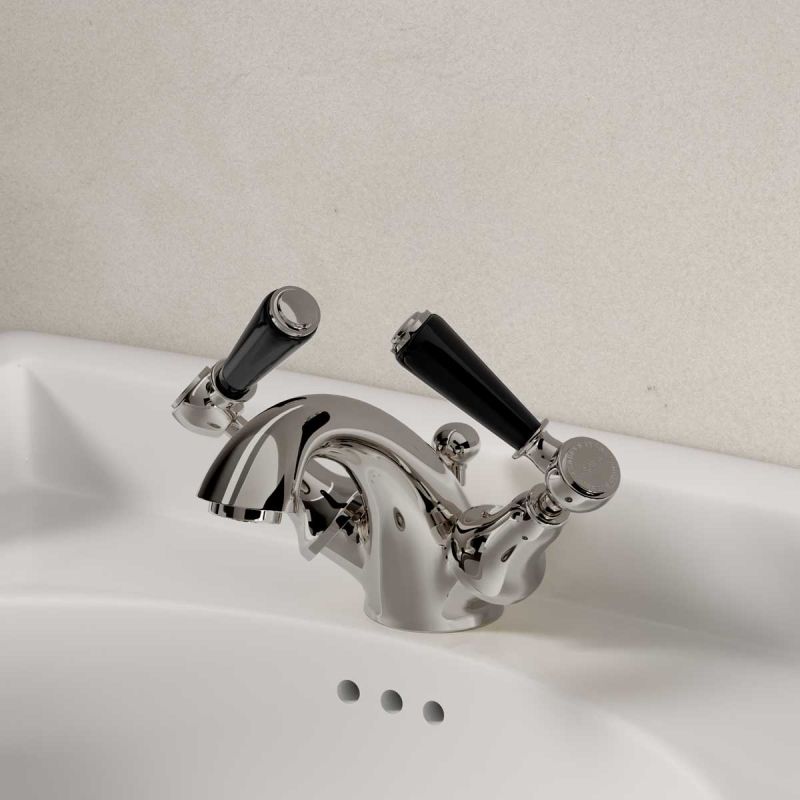 Linton Deck Mounted Monobloc Basin Mixer with Pop Up Waste - Black Lever - Polished Nickel
