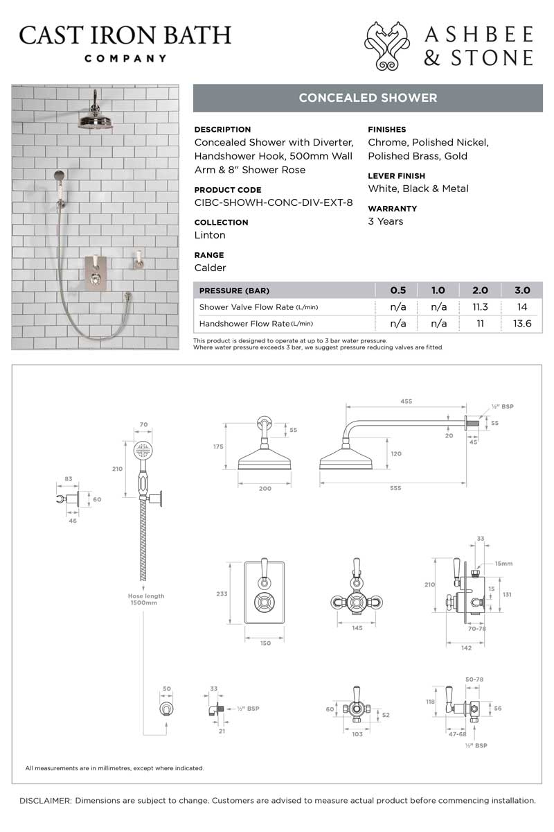 All Ashbee and Stone showers have a minimum working pressure of 0.5 BAR and a maximum working pressure of 5 BAR.