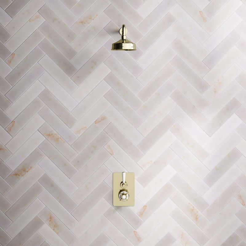 The Ashbee and Stone Concealed Shower Valve, Shower Arm and 6" Rose White Lever Timeless Brass White Lever.