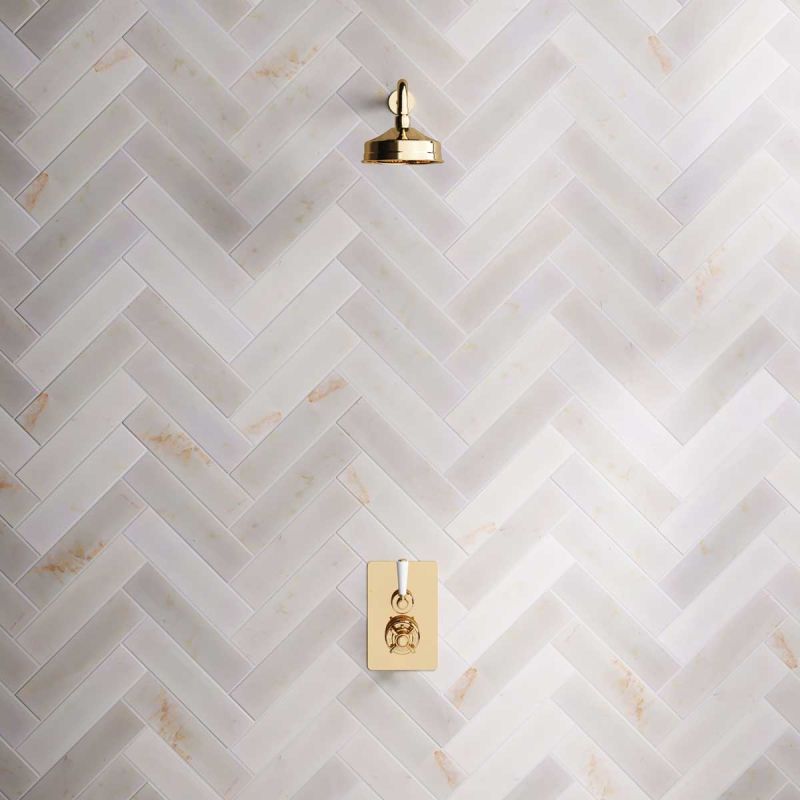 Linton Single Outlet Concealed Shower with 500mm Wall Arm & 6" Rose - White Lever - Living Brass