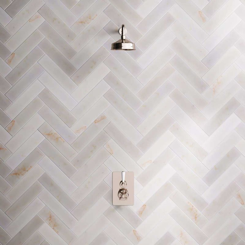 All Ashbee and Stone showers have a minimum working pressure of 0.5 BAR and a maximum working pressure of 5 BAR.Inspired by Edwardian period showerware, Ashbee and Stone offer this beautifully finished concealed shower set. The valve. Machined from solid brass, is fitted with a German engineered ceramic thermostatic cartridge, porcelain indicator bezel, cross head temperature controller, porcelain operation lever and is faced with brass cover plate. The shower set is completed with shower arm and 6 inch apron shower rose. Matches perfectly with our Asygarth and Linton ranges of taps.