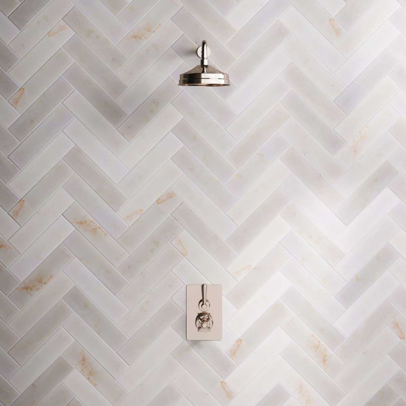 Inspired by Edwardian period showerware, Ashbee and Stone offer this beautifully finished concealed shower set. The valve, machined from solid brass, is fitted with a German engineered ceramic thermostatic cartridge, metal indicator bezel, cross head temperature controller, porcelain operation lever and is faced with brass cover plate. The shower set is completed with shower arm and 8 inch apron rainfall shower rose. Matches perfectly with our Asygarth and Linton ranges of taps.