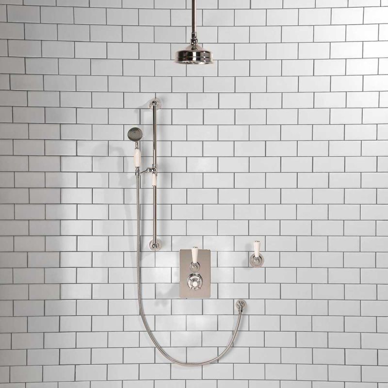 All Ashbee and Stone showers have a minimum working pressure of 0.5 BAR and a maximum working pressure of 5 BAR.Inspired by Edwardian period showerware, Ashbee and Stone offer this beautifully finished exposed shower set. The valve. machined from solid brass, is fitted with a German engineered ceramic thermostatic cartridge, porcelain indicator bezel, cross head temperature controller and porcelain operation lever. The shower set is completed with brass construction rigid riser, porcelain levered diverter valve, shower arm , 8 inch apron shower rose and adjustable hand held shower. Matches perfectly with our Asygarth and Linton ranges of taps.