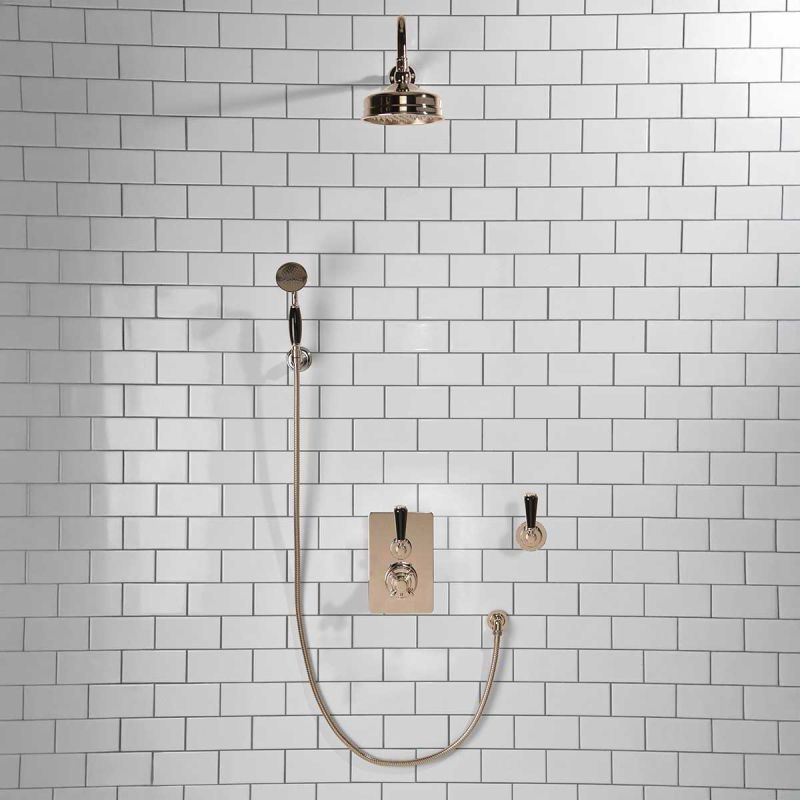 Inspired by Edwardian period showerware, Ashbee and Stone offer this beautifully finished exposed shower set. The valve, machined from solid brass, is fitted with a German engineered ceramic thermostatic cartridge, porcelain indicator bezel, cross head temperature controller and porcelain operation lever. Matches perfectly with our Asygarth and Linton ranges of taps.