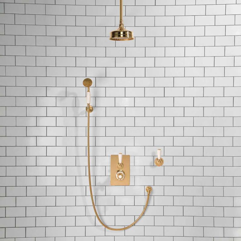 Calder Concealed Shower Valve Kit with Diverter and Hook Mount And 6 inch Ceiling Mounted Rose White Lever Polished Brass (Min 2 Bar Pressure)
