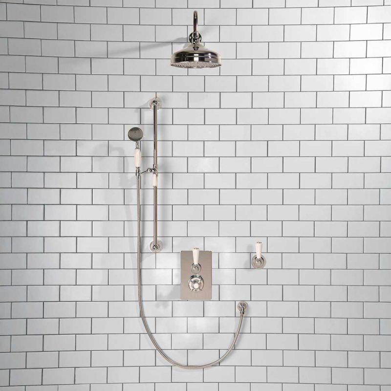 All Ashbee and Stone showers have a minimum working pressure of 0.5 BAR and a maximum working pressure of 5 BAR.Inspired by Edwardian period showerware, Ashbee and Stone offer this beautifully finished exposed shower set. The valve. machined from solid brass, is fitted with a German engineered ceramic thermostatic cartridge, porcelain indicator bezel, cross head temperature controller and porcelain operation lever. The shower set is completed with brass construction rigid riser, porcelain levered diverter valve, shower arm , 8 inch apron shower rose and adjustable hand held shower. Matches perfectly with our Asygarth and Linton ranges of taps.