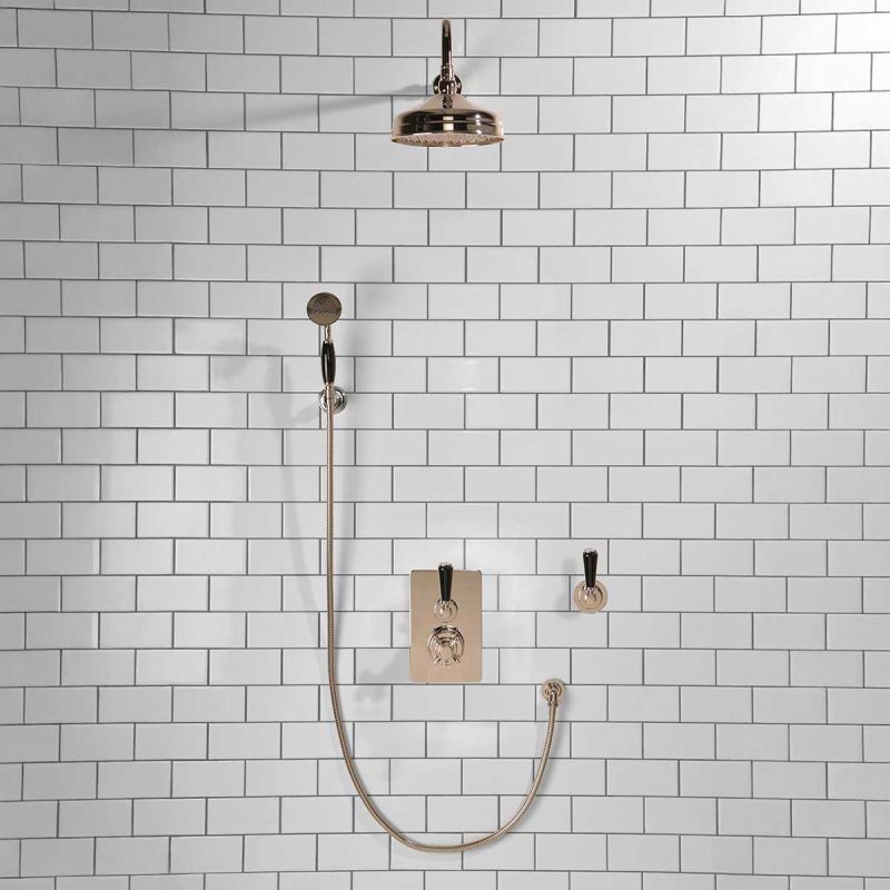 All Ashbee and Stone showers have a minimum working pressure of 0.5 BAR and a maximum working pressure of 5 BAR.Polished nickel is a living finish and as such will change over time as it reacts with its environment.Inspired by Edwardian period showerware, Ashbee and Stone offer this beautifully finished exposed shower set. The valve, machined from solid brass, is fitted with a German engineered ceramic thermostatic cartridge, porcelain indicator bezel, cross head temperature controller and porcelain operation lever. Matches perfectly with our Asygarth and Linton ranges of taps.