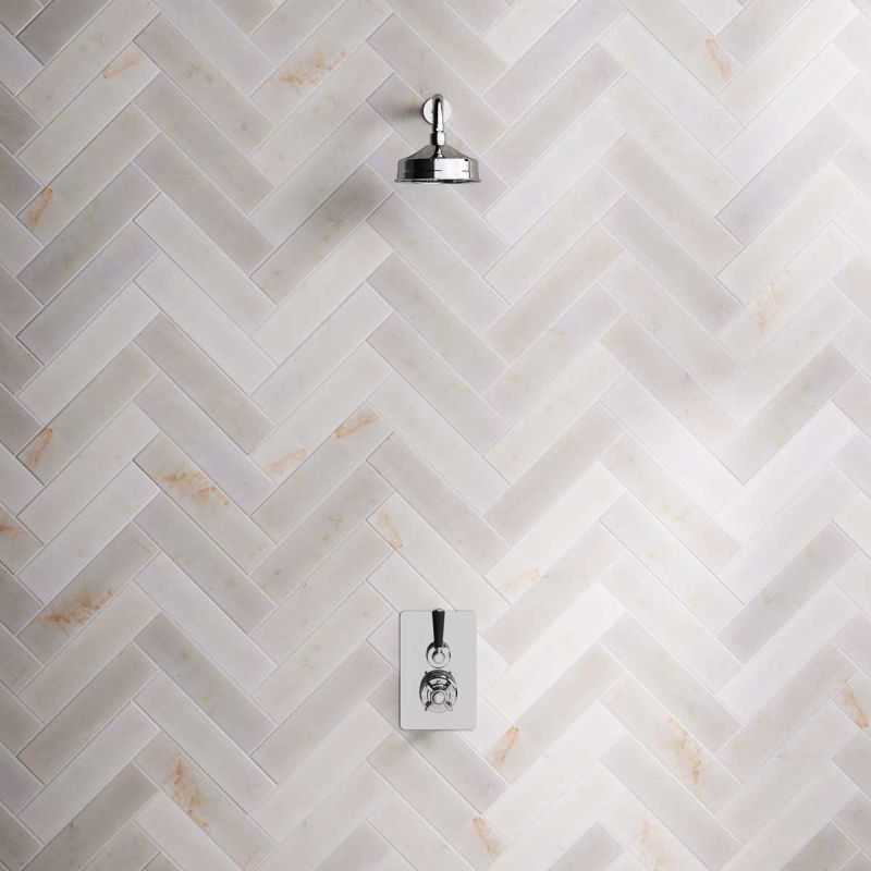 All Ashbee and Stone showers have a minimum working pressure of 0.5 BAR and a maximum working pressure of 5 BAR.Inspired by Edwardian period showerware, Ashbee and Stone offer this beautifully finished concealed shower set. The valve. Machined from solid brass, is fitted with a German engineered ceramic thermostatic cartridge, metal indicator bezel, cross head temperature controller, porcelain operation lever and is faced with brass cover plate. The shower set is completed with shower arm and 8 inch apron shower rose. Matches perfectly with our Asygarth and Linton ranges of taps.