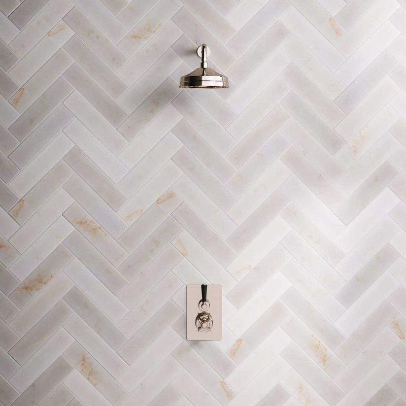 Inspired by Edwardian period showerware, Ashbee and Stone offer this beautifully finished concealed shower set. The valve. Machined from solid brass, is fitted with a German engineered ceramic thermostatic cartridge, metal indicator bezel, cross head temperature controller, porcelain operation lever and is faced with brass cover plate. The shower set is completed with shower arm and apron shower rose. Matches perfectly with our Asygarth and Linton ranges of taps.