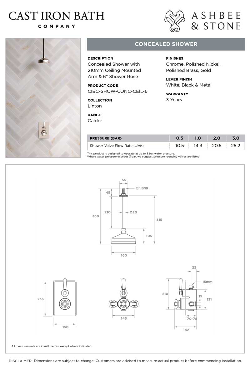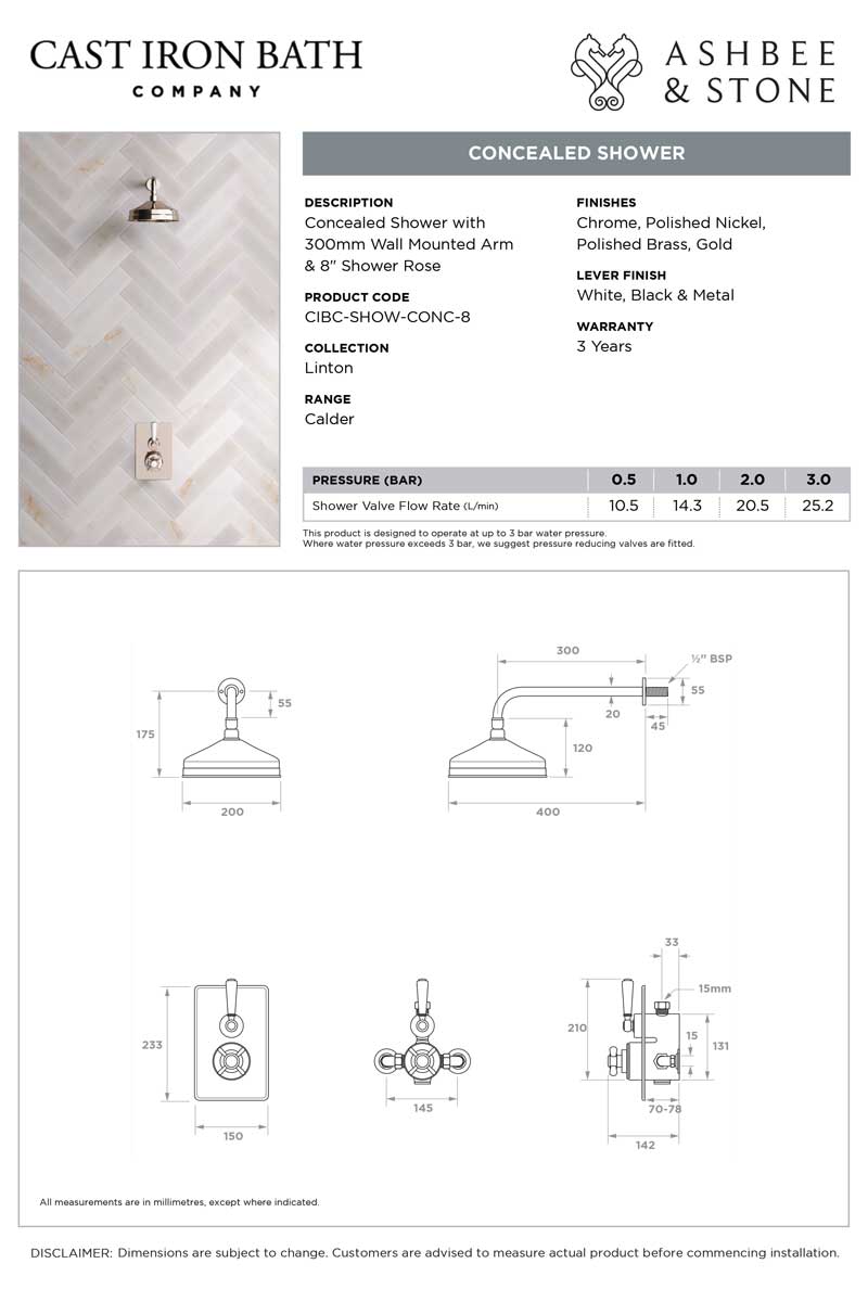 All Ashbee and Stone showers have a minimum working pressure of 0.5 BAR and a maximum working pressure of 5 BAR.Our Polished Brass offering is designed as a 'living finish' product. The brass is not lacquered and its appearance will change over time as the brass oxidises in the air - the product is polished prior to dispatch but it will begin to 'age' once it has been installed. The product has been designed this way to realise the beauty of the aged brass finish that has been requested by many of our customers.