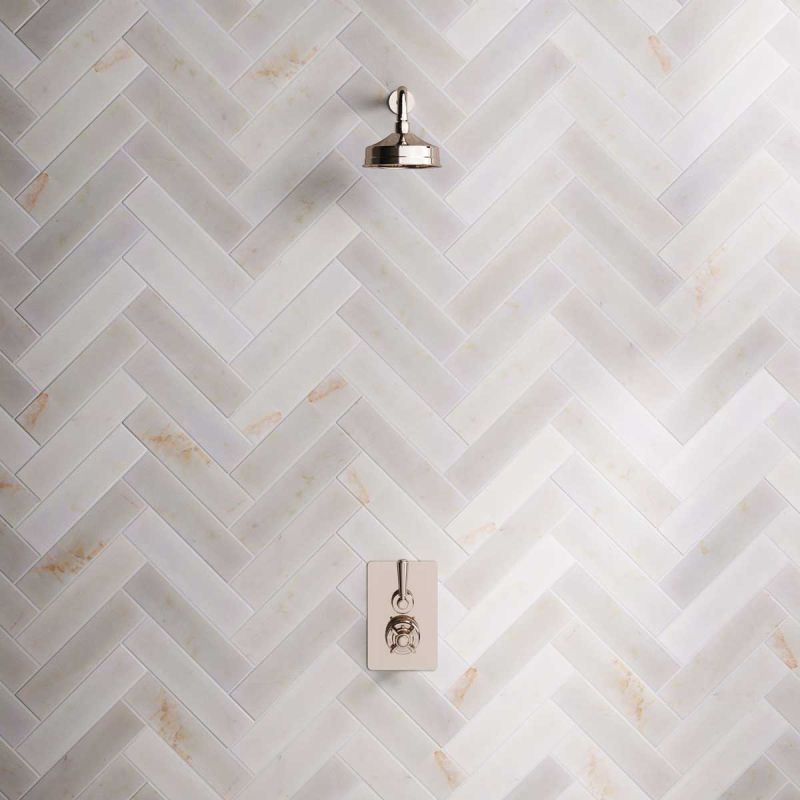 Inspired by Edwardian period showerware, Ashbee and Stone offer this beautifully finished concealed shower set. The valve, machined from solid brass, is fitted with a German engineered ceramic thermostatic cartridge, metal indicator bezel, cross head temperature controller, porcelain operation lever and is faced with brass cover plate. The shower set is completed with shower arm and 8 inch apron rainfall shower rose. Matches perfectly with our Asygarth and Linton ranges of taps.