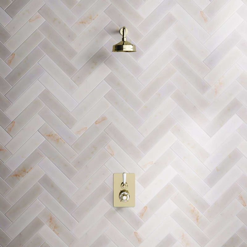 The Ashbee and Stone Concealed Shower Valve, Shower Arm and 6" Rose White Lever Timeless Brass White Lever.