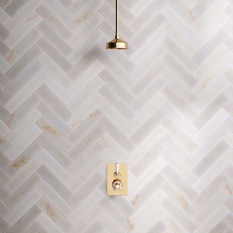 The Ashbee and Stone Concealed Shower Valve, Shower Arm and 6" Rose White Lever Polished Brass White Lever.