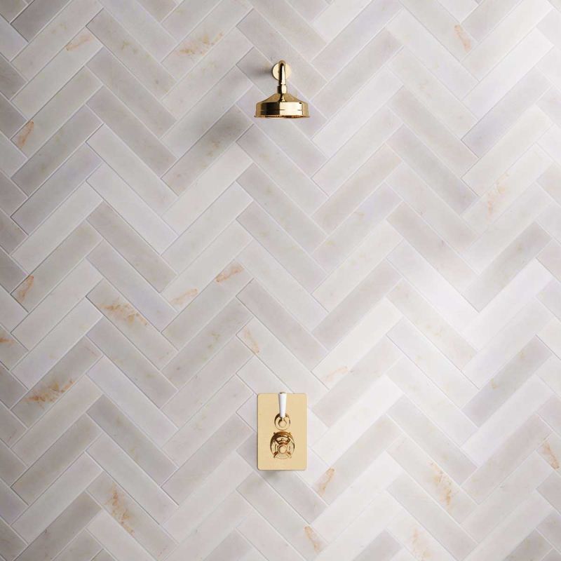 Linton Single Outlet Concealed Shower with 300mm Wall Arm & 6" Rose - White Lever - Living Brass