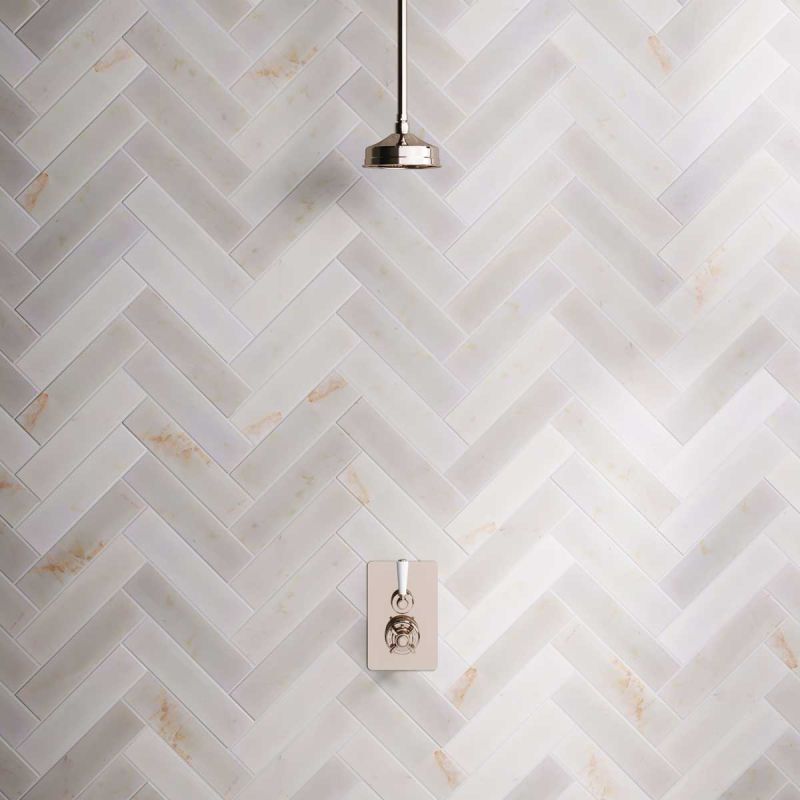 The Ashbee and Stone Concealed Shower Valve, Shower Arm and 6" Rose White Lever Polished Nickel White Lever.