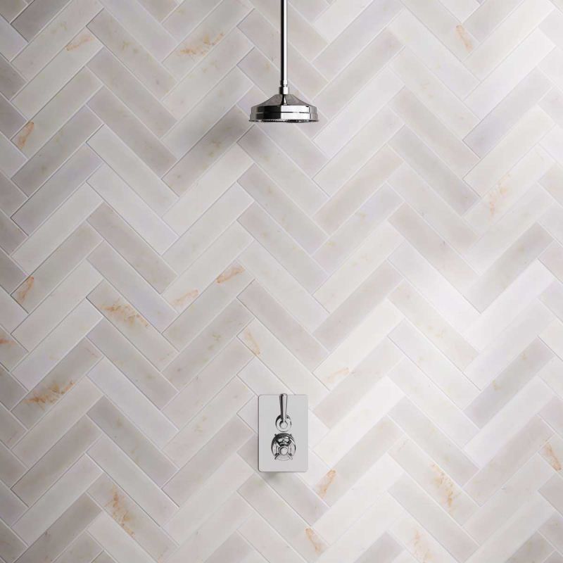 All Ashbee and Stone showers have a minimum working pressure of 0.5 BAR and a maximum working pressure of 5 BAR.Inspired by Edwardian period showerware, Ashbee and Stone offer this beautifully finished concealed shower set. The valve, machined from solid brass, is fitted with a German engineered ceramic thermostatic cartridge, metal indicator bezel, cross head temperature controller, porcelain operation lever and is faced with brass cover plate. The shower set is completed with shower arm and 8 inch apron rainfall shower rose. Matches perfectly with our Asygarth and Linton ranges of taps.