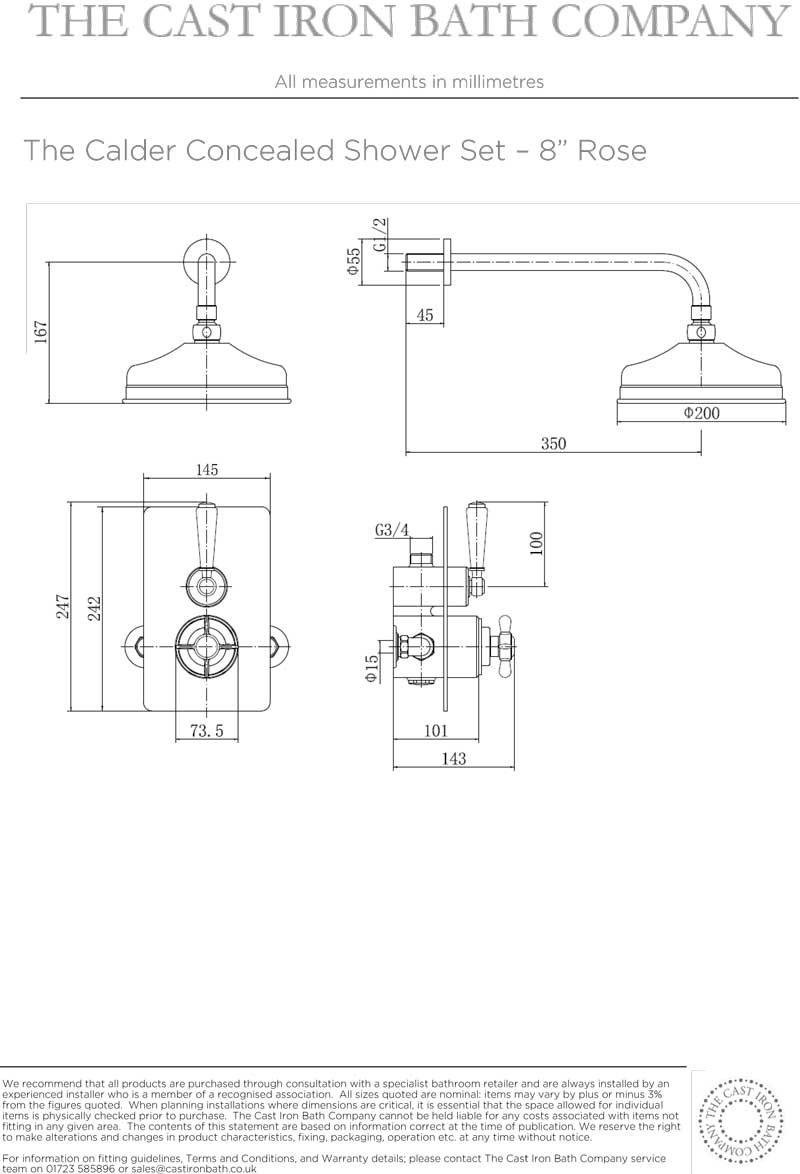 Calder Concealed Shower Valve, Shower Arm and 8 inch Ceiling Mounted Rose White Lever Timeless Brass
