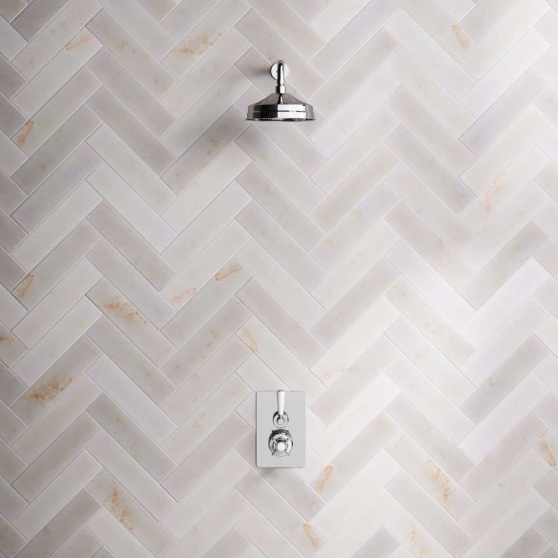 The Ashbee and Stone Concealed Shower Valve, Shower Arm and 8" Rose White Lever Chrome Plated White Lever.