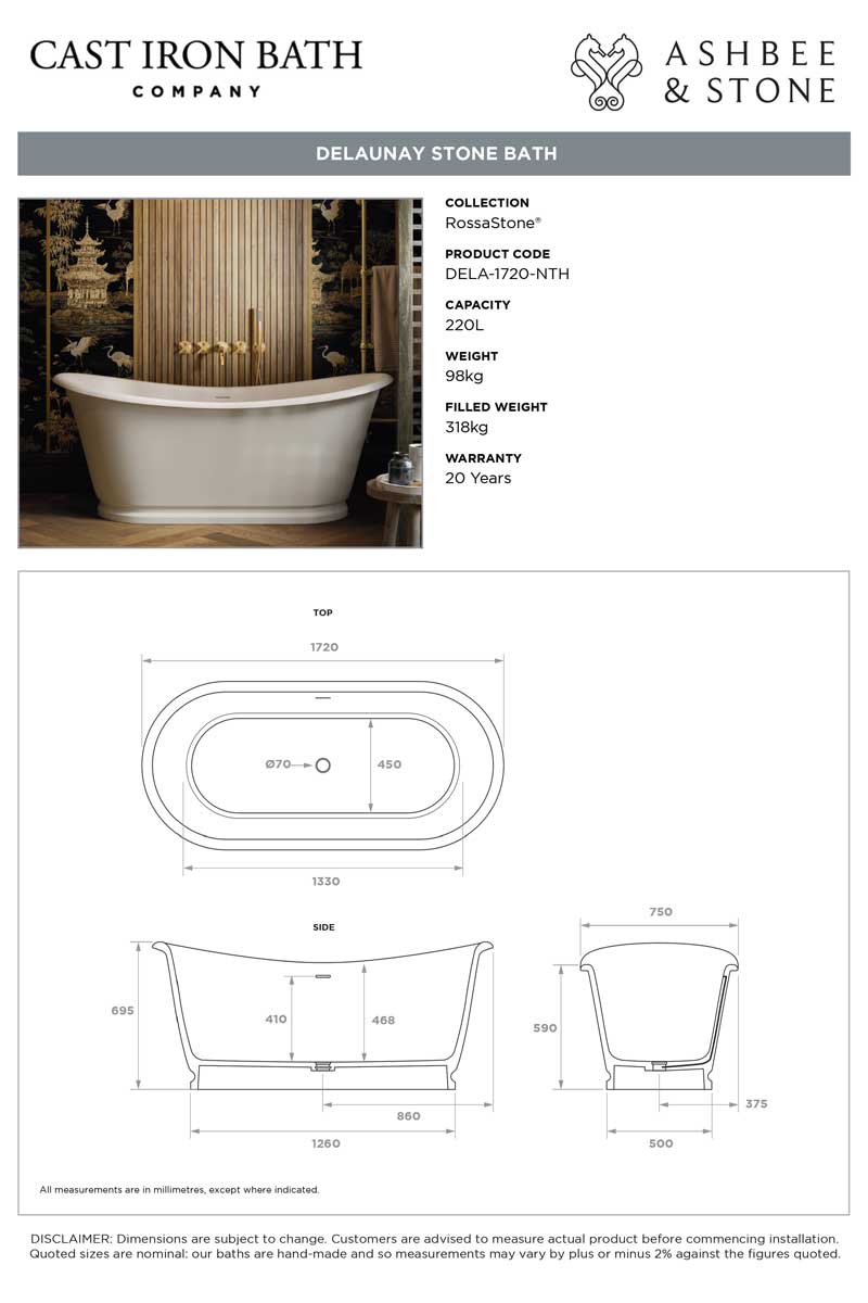 The Delaunay Bateau Bath, made from RossaStone® composite, is antibacterial, UV-resistant, and easy to clean. Available in 1720mm (98kg) and 1536mm (92kg) sizes with an integrated waste.