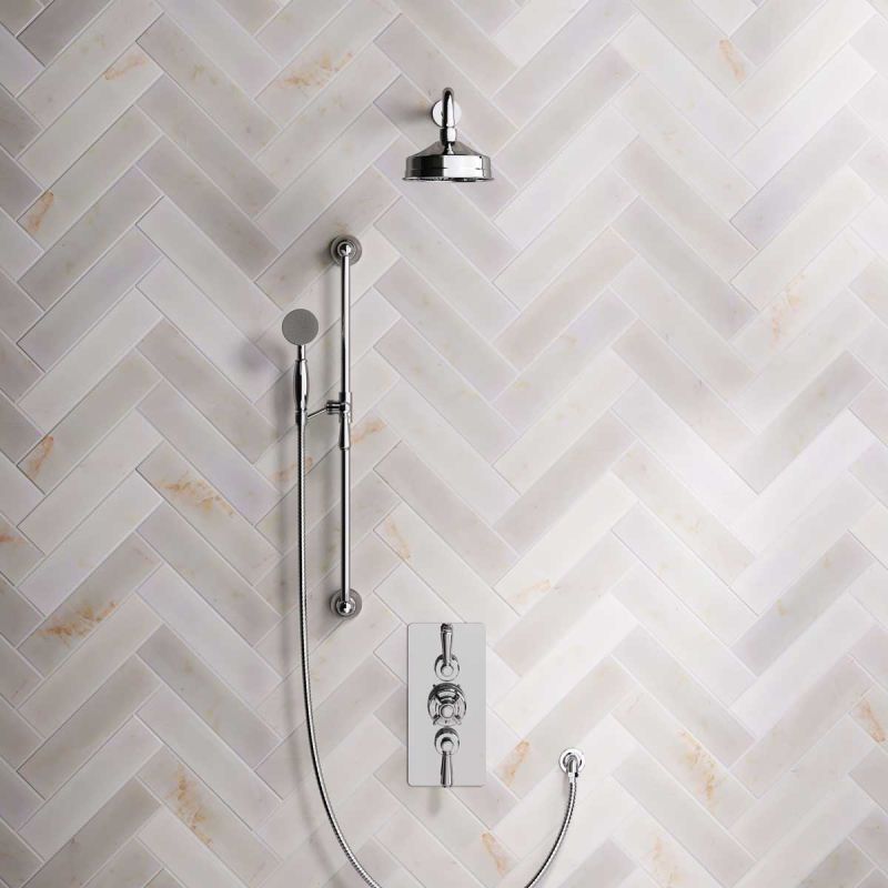 The Ashbee and Stone Chrome Finish Concealed Dual Outlet Shower Valve with Shower Arm and Diverter Handshower mounted onto a Slider-Rail. Shower is supplied with Metal Levers and an 6 inch apron rose.
