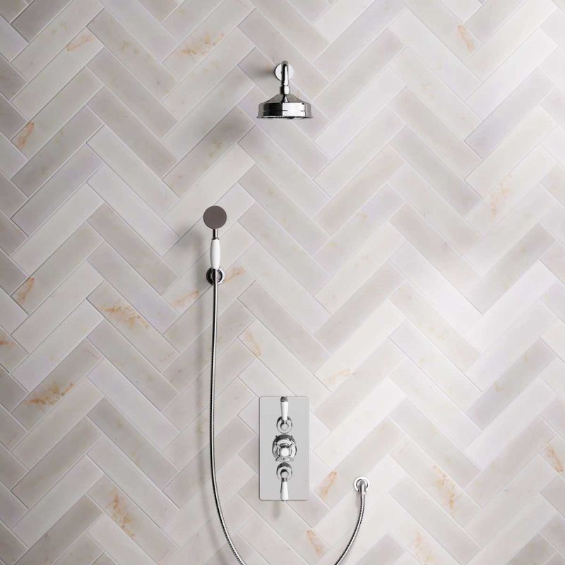 Calder Dual Outlet Shower Kit - Concealed Valve - 6 inch Rose - 500mm Shower Arm - White Ceramic Lever - Handshower Hook - Chrome Finish