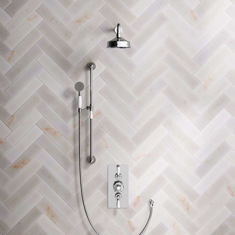 The Ashbee and Stone Chrome Finish Concealed Dual Outlet Shower Valve with Shower Arm and Diverter Handshower mounted onto Slider-Rail. Shower is supplied with White Ceramic Levers and an 6 inch apron rose.