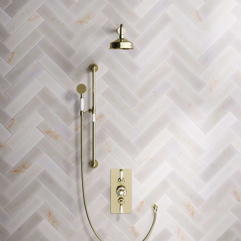 The Ashbee and Stone Gold Concealed Dual Outlet Shower Valve with Shower Arm and Diverter Handshower mounted onto Slider-Rail. Shower is supplied with White Ceramic Levers and an 6 inch apron rose.