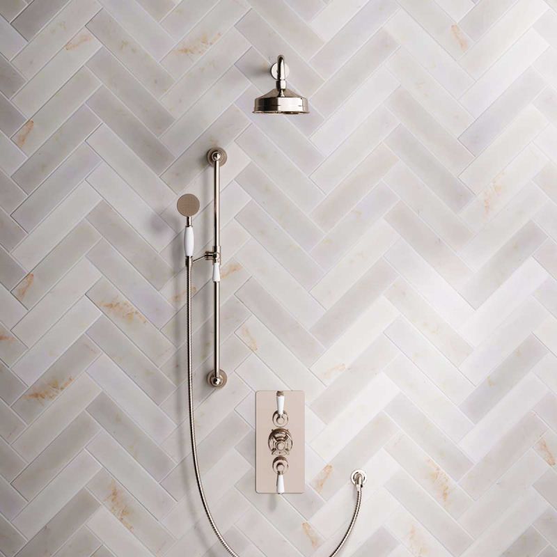The Ashbee and Stone Polished Nickel Concealed Dual Outlet Shower Valve with Shower Arm and Diverter Handshower mounted onto Slider-Rail. Shower is supplied with White Ceramic Levers and an 6 inch apron rose.
