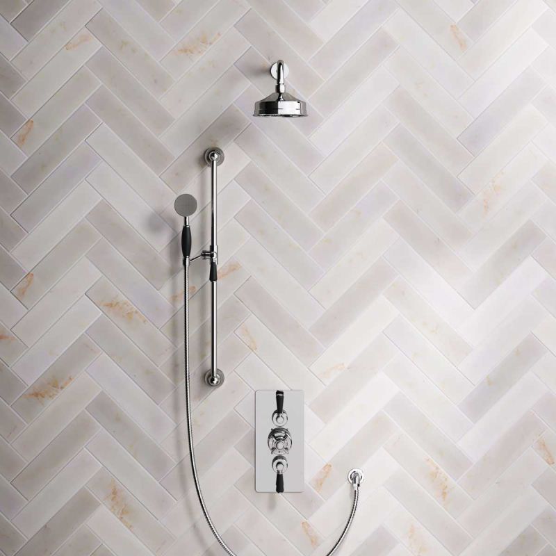 The Ashbee and Stone Chrome Finish Concealed Dual Outlet Shower Valve with Shower Arm and Diverter Handshower mounted onto a Slider-Rail. Shower is supplied with Black Ceramic Levers and an 6 inch apron rose.