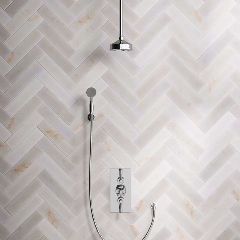 The Ashbee and Stone Chrome Finish Concealed Dual Outlet Shower Valve with Shower Arm and Diverter Handshower mounted onto a Hook. Shower is supplied with Metal Levers and an 6 inch apron rose.