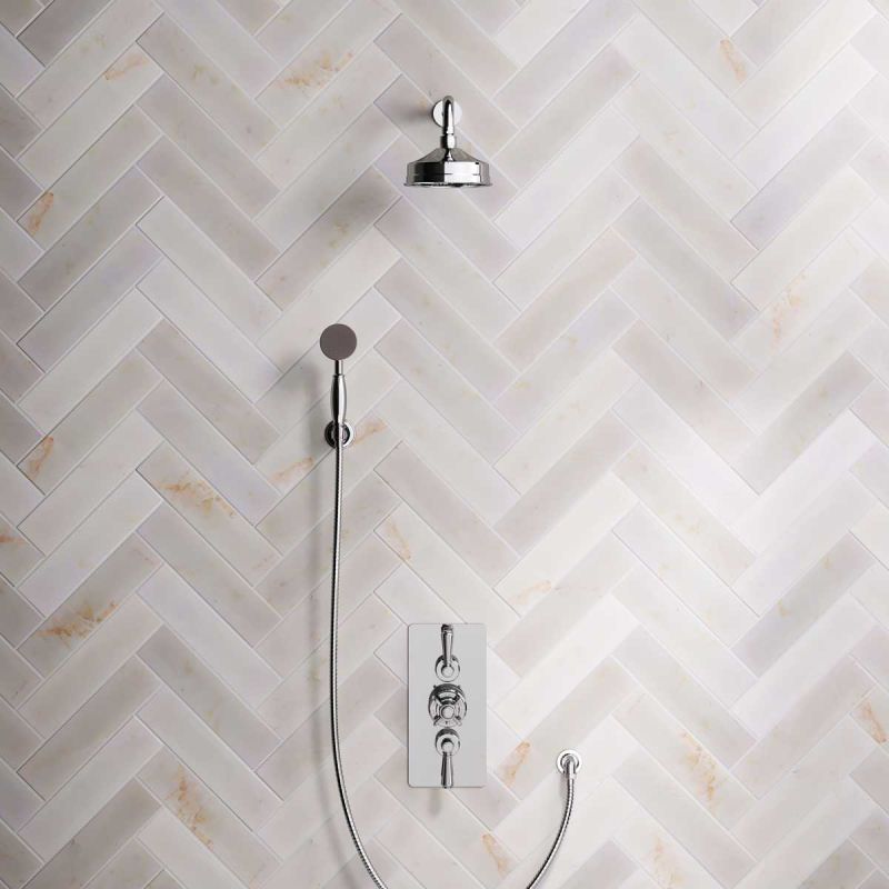 The valve, machined from solid brass, is fitted with a German engineered ceramic thermostatic cartridge, metal indicator bezel, cross head temperature controller, operation levers and is faced with brass cover plate. The shower set is completed with shower arm and 6 inch apron rainfall shower rose. The handshower is mounted onto a Hook. Matches perfectly with our Asygarth and Linton ranges of taps.