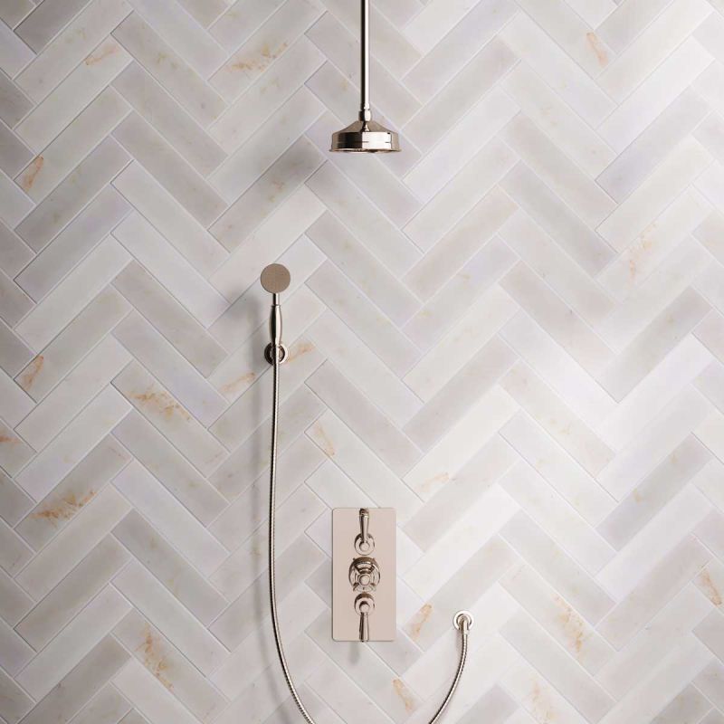 Inspired by Edwardian period showerware, Ashbee and Stone offer this beautifully finished concealed dual outlet shower set in Polished Nickel.