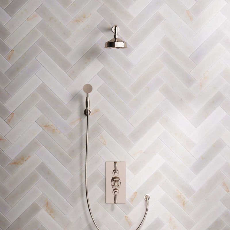Inspired by Edwardian period showerware, Ashbee and Stone offer this beautifully finished concealed dual outlet shower set in Polished Nickel.