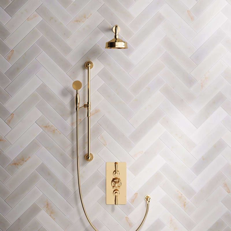 Inspired by Edwardian period showerware, Ashbee and Stone offer this beautifully finished concealed dual outlet shower set in Living Brass.