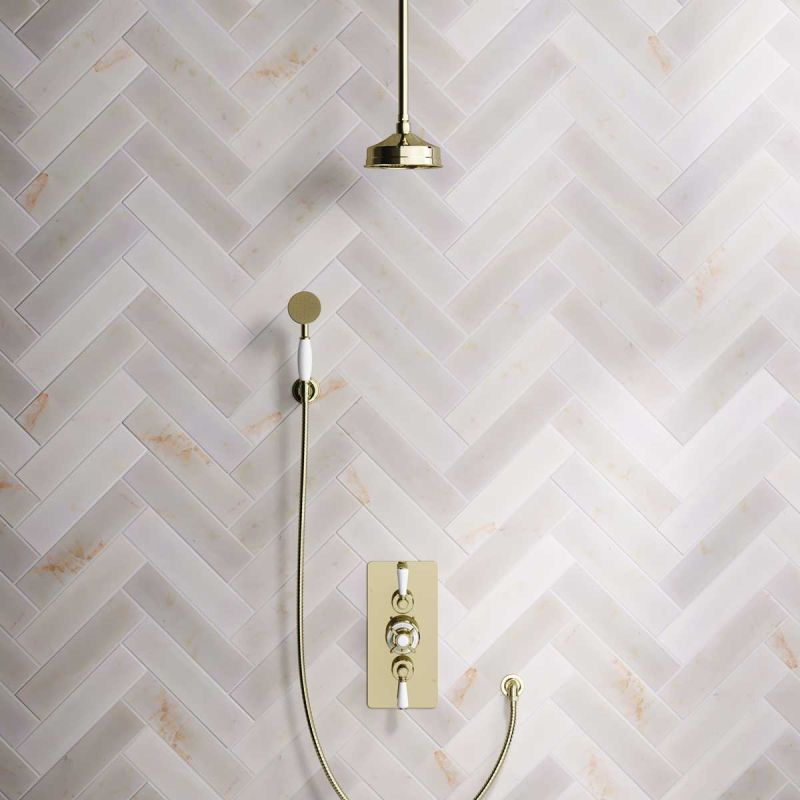 The Ashbee and Stone Gold Concealed Dual Outlet Shower Valve with Shower Arm and Diverter Handshower mounted onto Hook. Shower is supplied with White Ceramic Levers and an 6 inch apron rose.