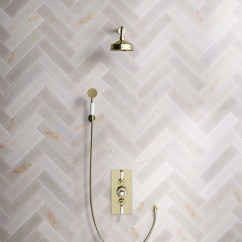 Calder Dual Outlet Shower Kit - Concealed Valve - 6 inch Rose - White Ceramic Lever - Handshower Hook - Gold