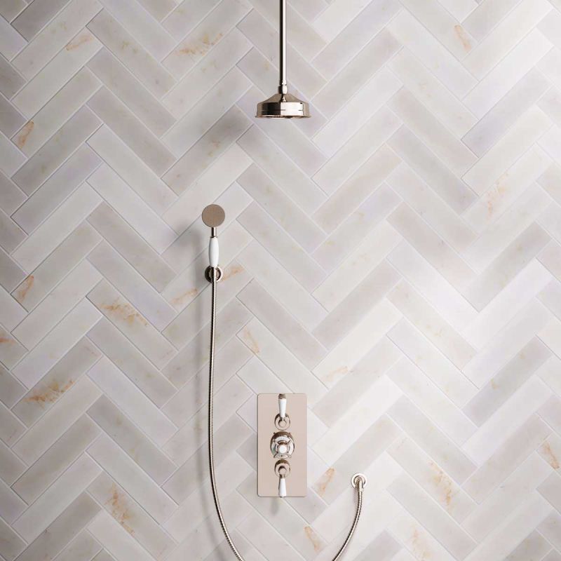 The Ashbee and Stone Polished Nickel Concealed Dual Outlet Shower Valve with Shower Arm and Diverter Handshower mounted onto Hook. Shower is supplied with White Ceramic Levers and an 6 inch apron rose.